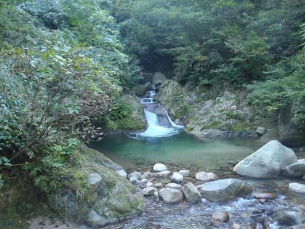 - 魚止めの滝(80分)山葵山(70分)松平山(95分)五頭山(75分)赤安山(50分)赤安山登山口(20分)魚止めの滝