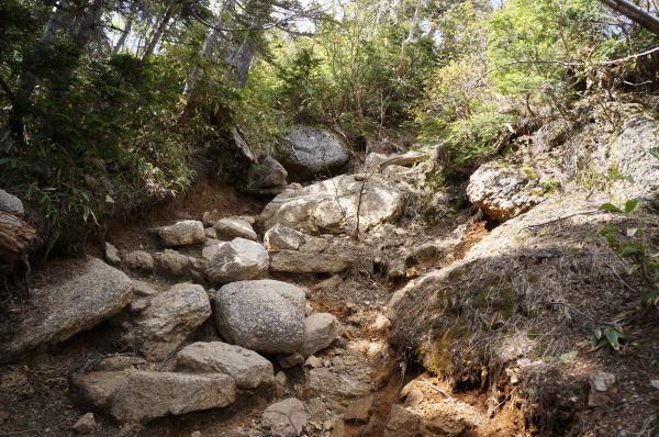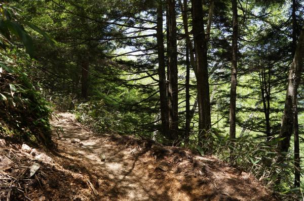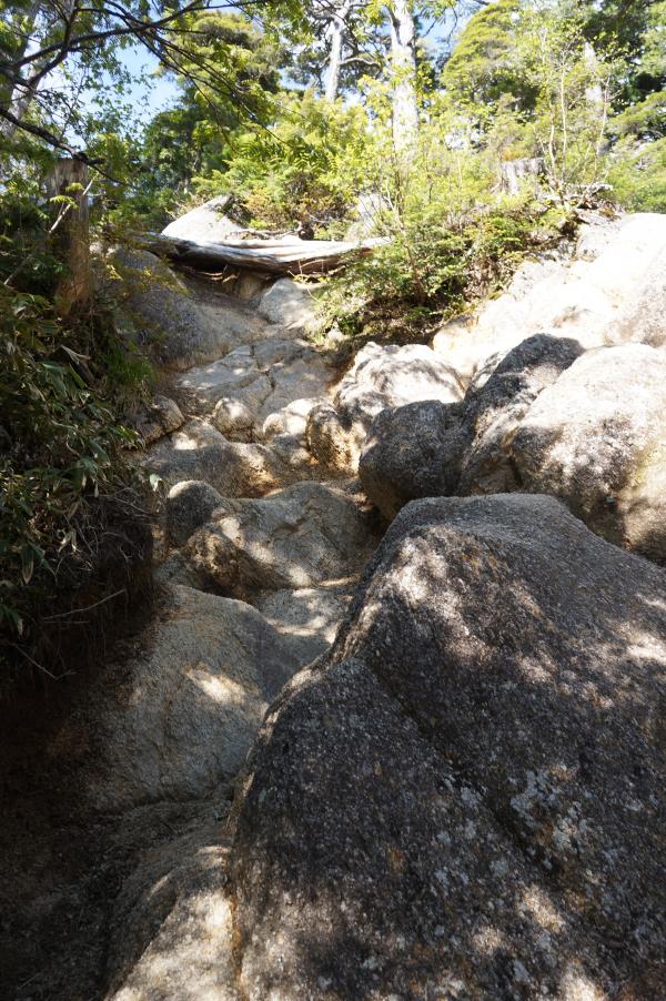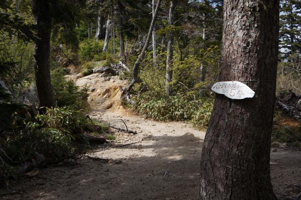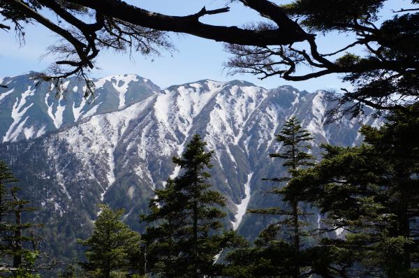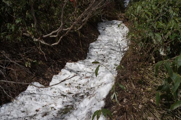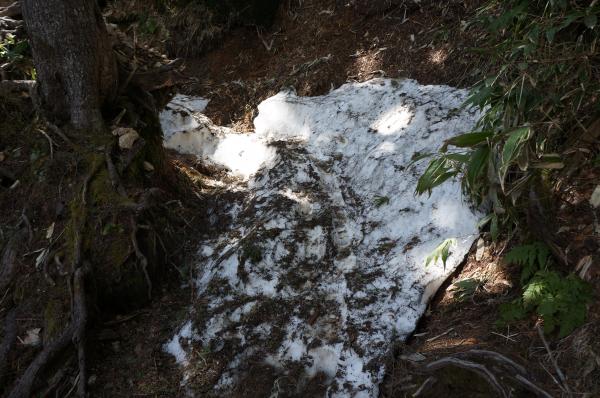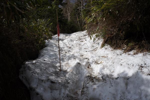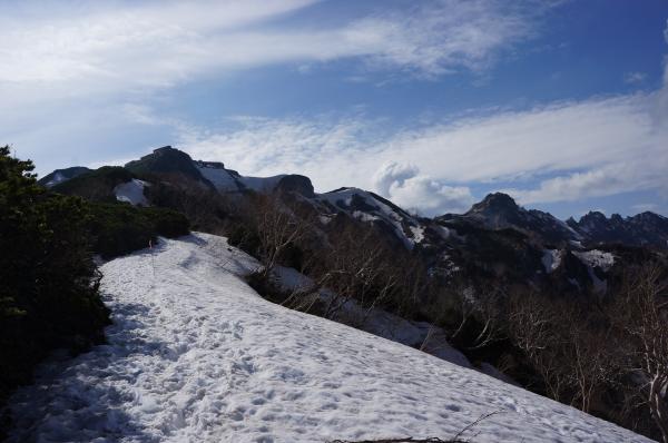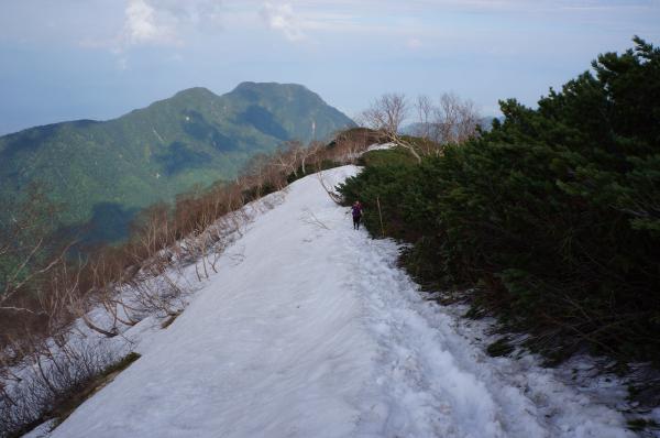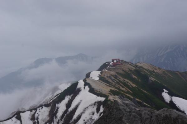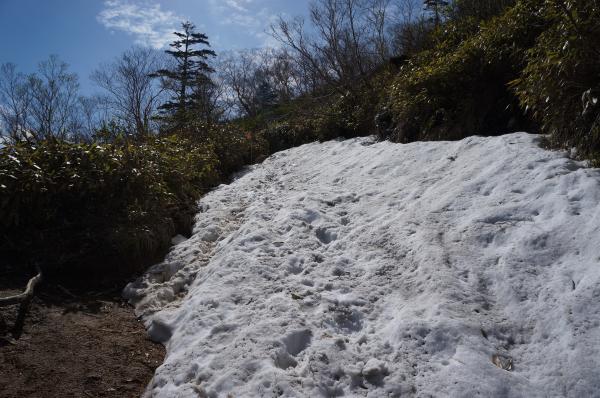 - 合戦小屋手前に少し残雪。合戦小屋から燕山荘までは所々長く残雪が続きました。昼過ぎだと日の光もありガチガチに凍っていることもなかったですが、6本爪の軽アイゼンがあると安心して登れます。