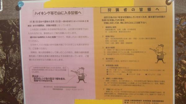 11/15~来年の2/15(一部の区域でニホンジカのみ2月末日)までの期間、狩猟が解禁になっています。特にバリエーションルートなど、登山道ではない所を歩かれる方は事故防止をお願いします。また、獲物を追う猟犬と出くわす事もあるかも知れません。