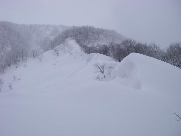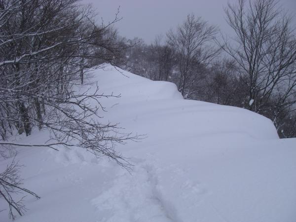 登りはかなりの積雪でラッセルを強いられて、息が続きませんでした。雪屁が出来る位の稜線に出ると、スノーシューが活躍!ただ、白山の尾根線では雪屁に気をつけて下さい。