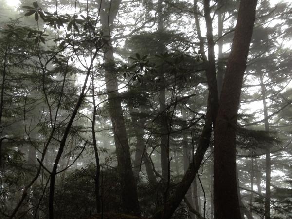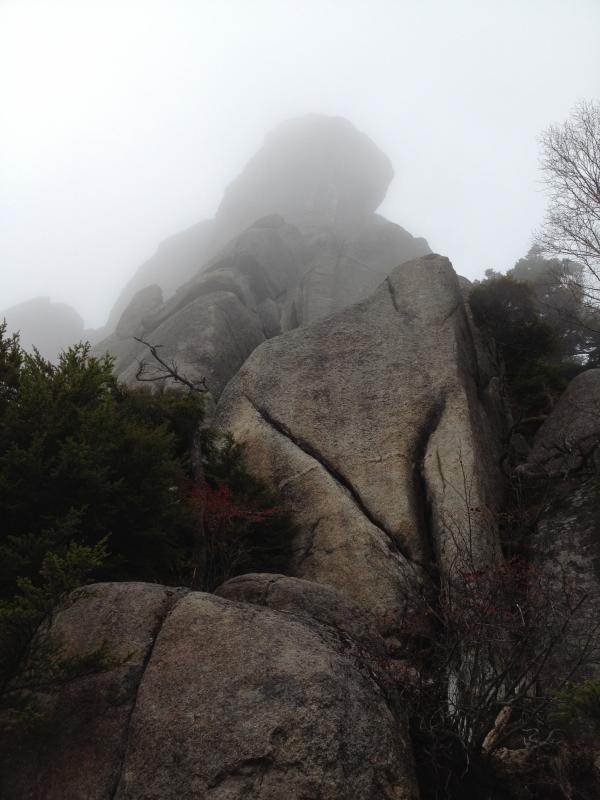 頂上はガスっていて展望はありませんでしたが、ごくまれに晴れ間が指すこともあり、霧の隙間から見える景色に夢中になってしまいました。山頂にいる誰もが、そんな気まぐれな太陽に振り回されていた様子。無我夢中でシャッターを切りまくる人々であふれておりました。