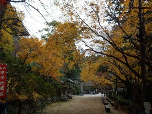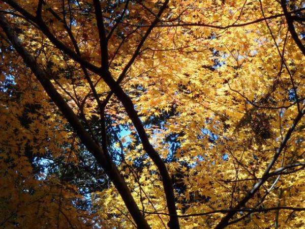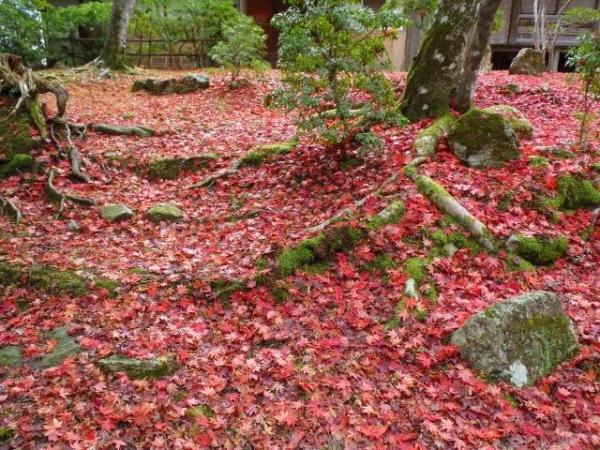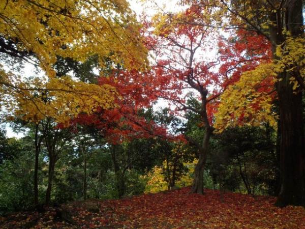 最盛期は終わり、枝から散り落ちた紅や黄色の葉が地面を鮮やかに染めていました。