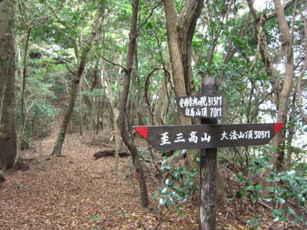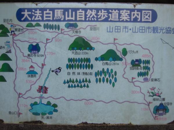 - 安国寺駐車場(10分)奥ノ院(15分)白馬山山頂(10分)大法山山頂(15分)展望所(10分)鬼子母神堂(10分)三光園分岐(15分)安国寺駐車場 *歩行時間のみ