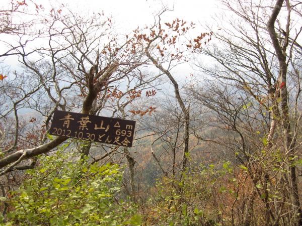 - 青葉山青少年旅行村駐車場 ―5分― 登山口 ―45分― 展望台 ―35分― 青葉山東峰(693m) ―30分― 大師洞 ―7分― 青葉山西峰(692m) ―50分― 今寺 ―80分(道迷い)― 青葉山青少年旅行駐車場