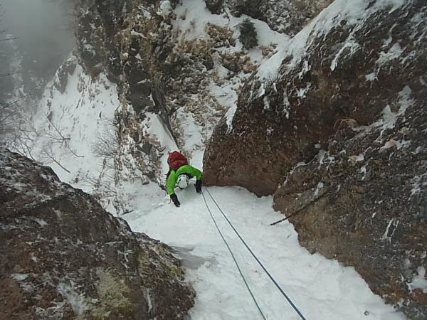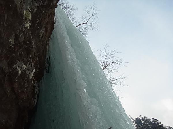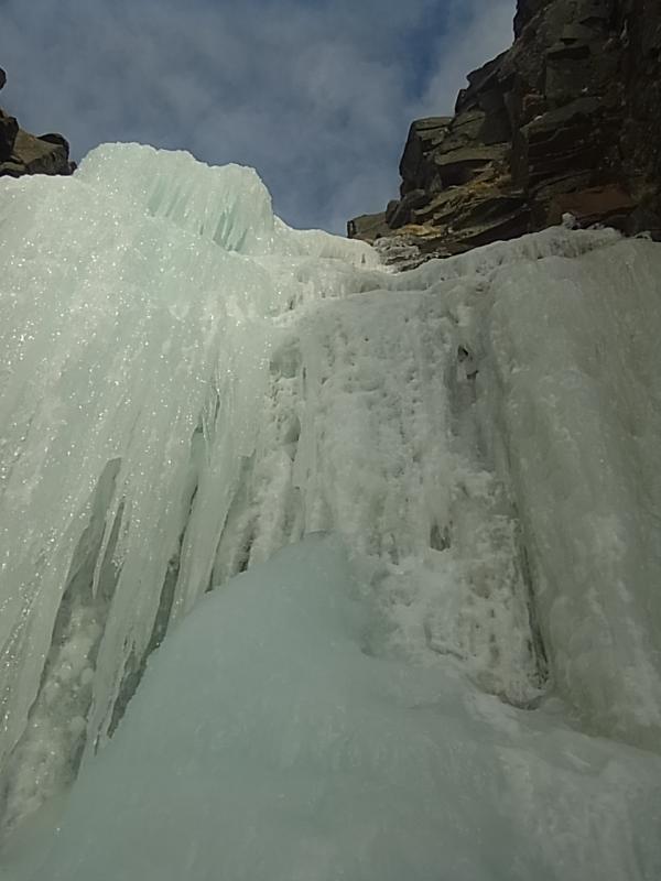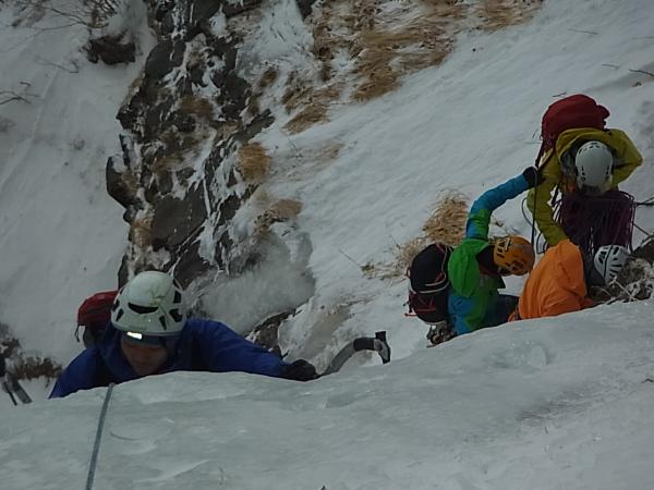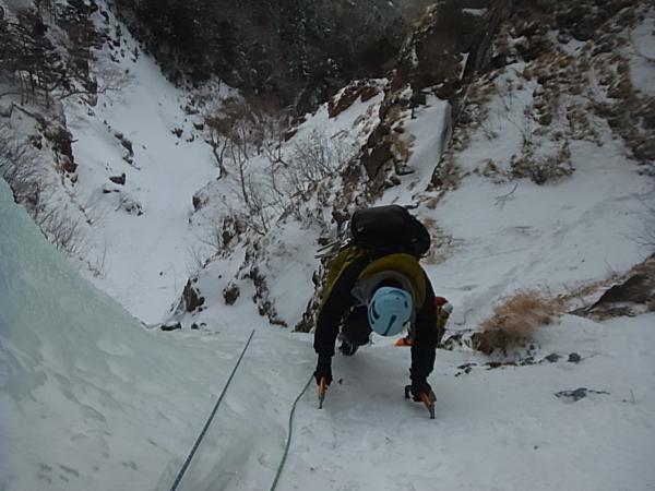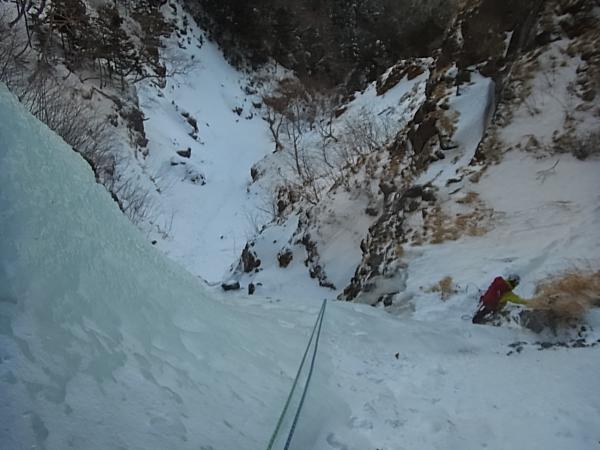 大同心大滝中段左側のビレイポイントで区切り、上段のヴァーチカルアイスへ。