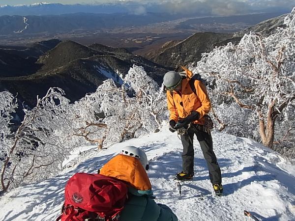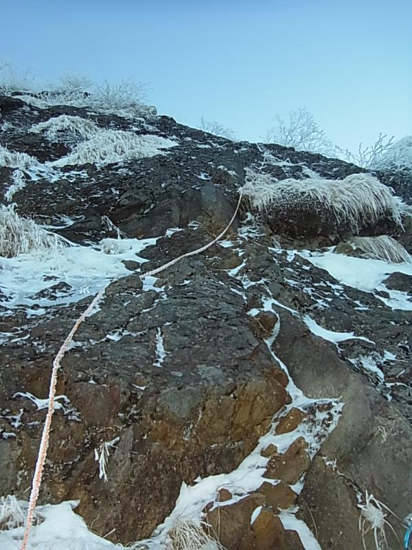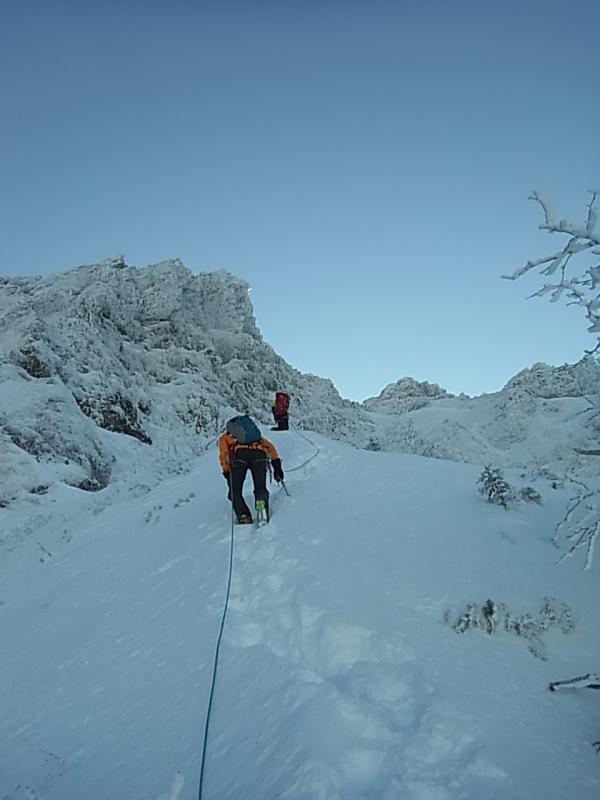 石尊稜の下部岩壁は残置支点や細いフィックスロープがあり、どのラインが一番良いのか分かりませんが、下部岩壁右寄りのビレイポイントから左上の立ち木へ抜けました。そこからしばらく雪稜を歩き、上部岩壁を1ピッチこなして、右寄りに歩いて稜線へ抜けました。