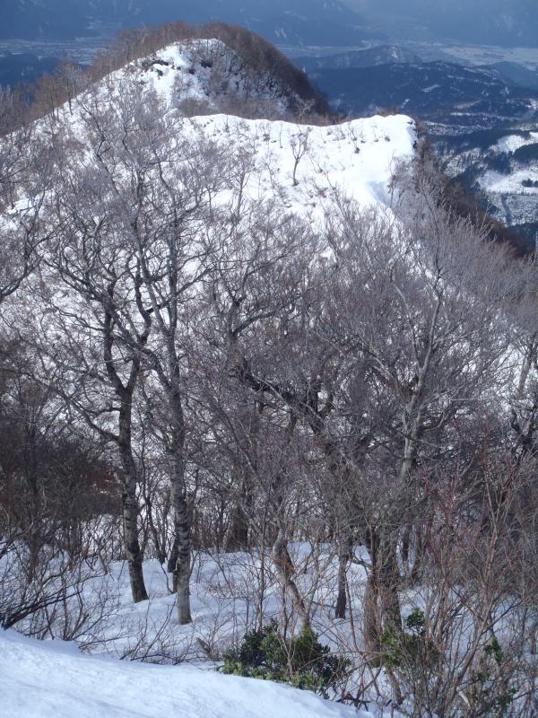 積雪は充分なのですが、低山ゆえに藪が多いので、踏み抜きのトラップがあらゆる場面で