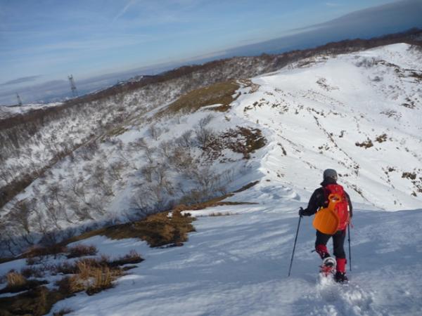 - スキー場からスノーシューを履きました。雪は積もっているものの、