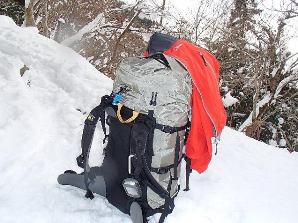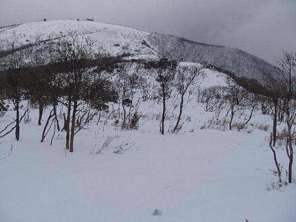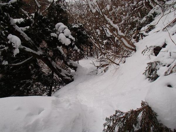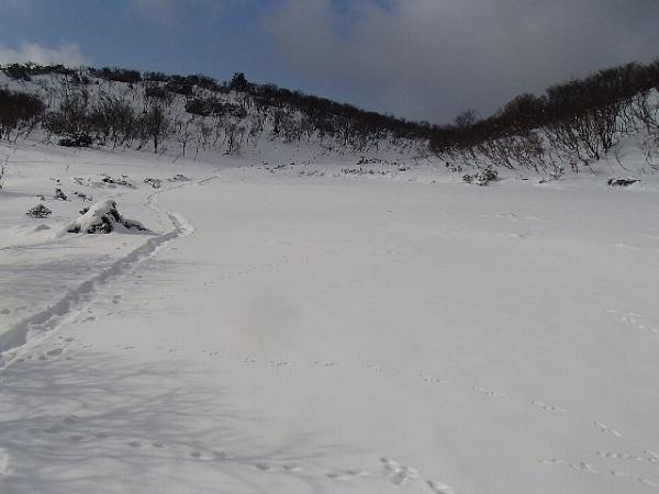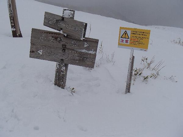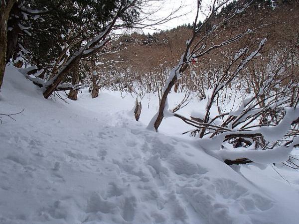 登山口から徐々に雪が増え、峠手前では笹や灌木の頭が雪から出ているくらいの雪の量です。