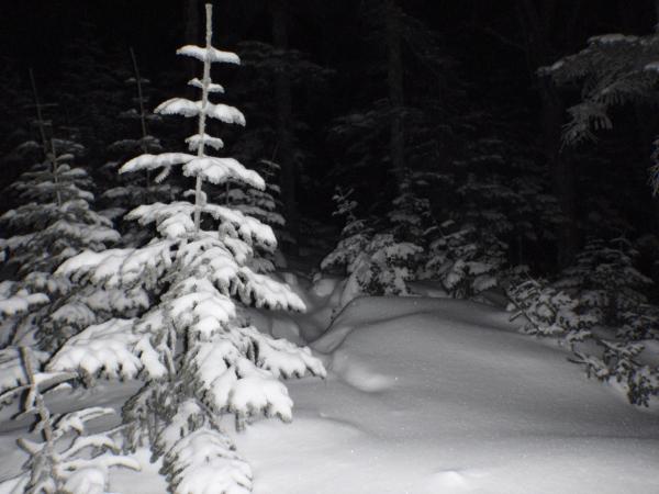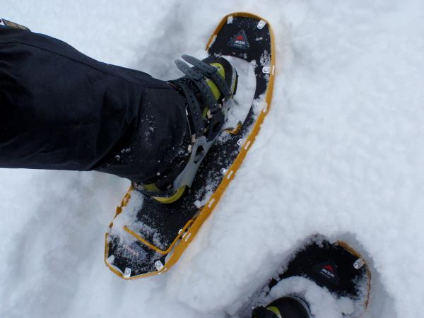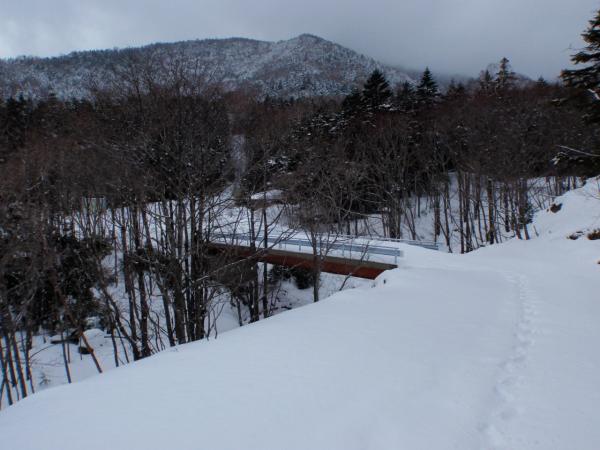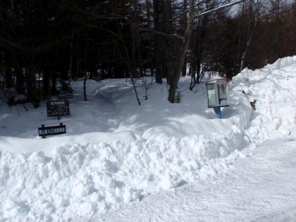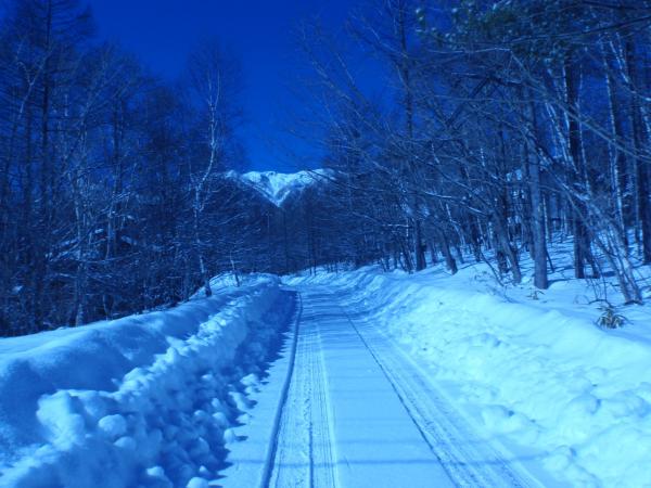 ロッジから登山口までは車で踏み固められた雪道を30分ほど歩きます。ここが一番滑るかもしれません。