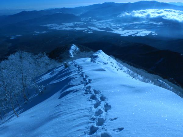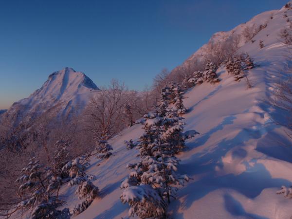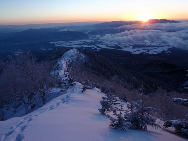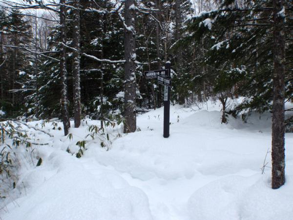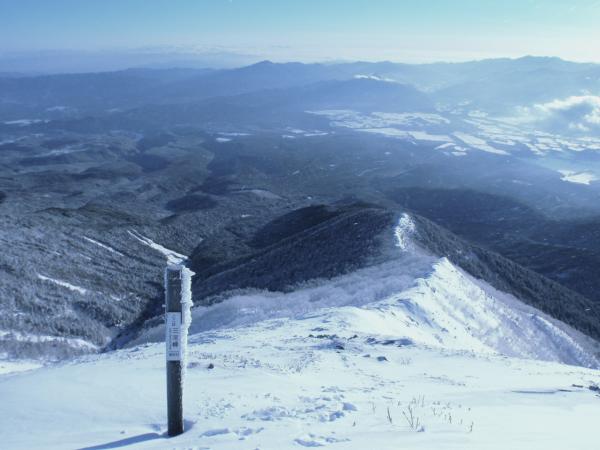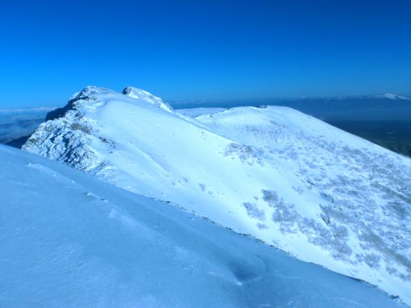 - 序盤の別荘地が細かい道が多く迷いやすい。予想外に時間を取られるかも。入る人が少ないコースのためか、けっこう潜る箇所が多い。平均してふくらはぎぐらい、稜線でも吹きだまりはひざぐらいまで潜る。道幅がわりと広い尾根なので、それほど危険箇所はない。三叉峰直下は傾斜もきついのでアイゼン、ピッケルなど冬山装備は必要。