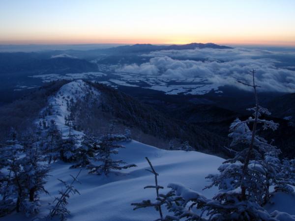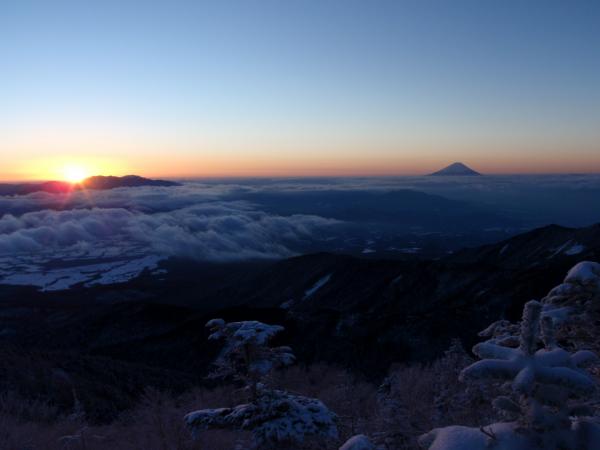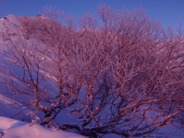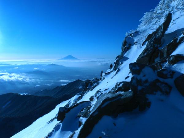 2600mぐらいからは視界も開けて、目指す横岳や赤岳の真っ白な姿に元気をもらいました。振り返れば野辺山の里や富士山も見えます。今回は日が昇るタイミングでモルゲンロートも楽しめて、快晴だったのでとても気持ちのよい尾根でした。