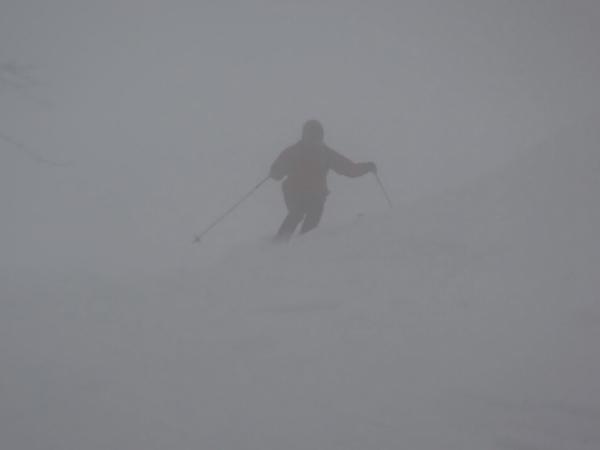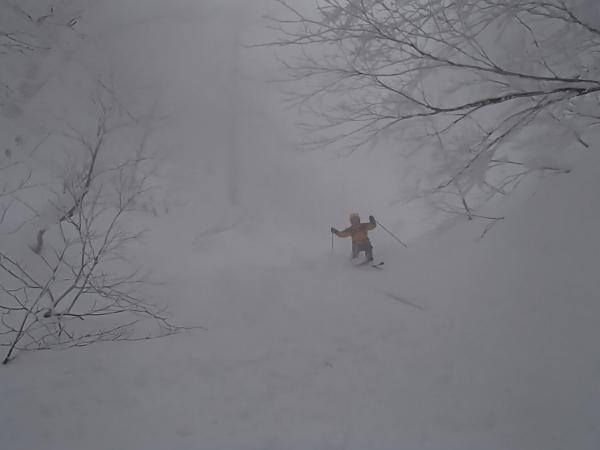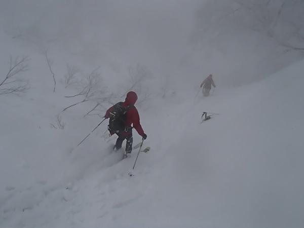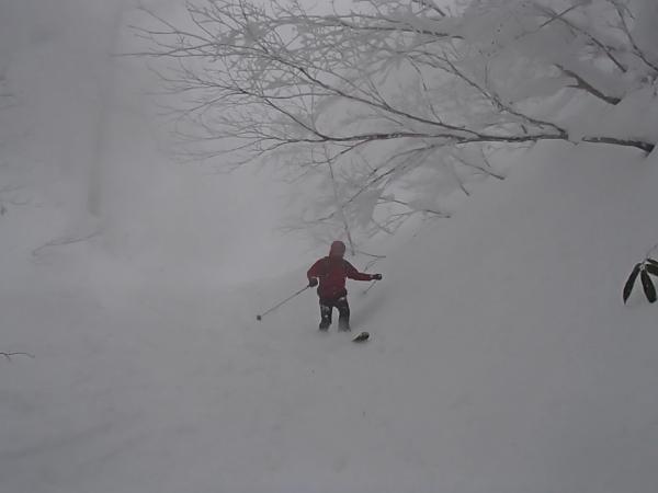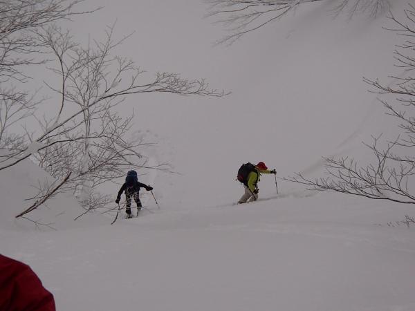新雪で、気持ちは良いのですが、斜度もきつく、雪崩も怖いので1人ずつ、