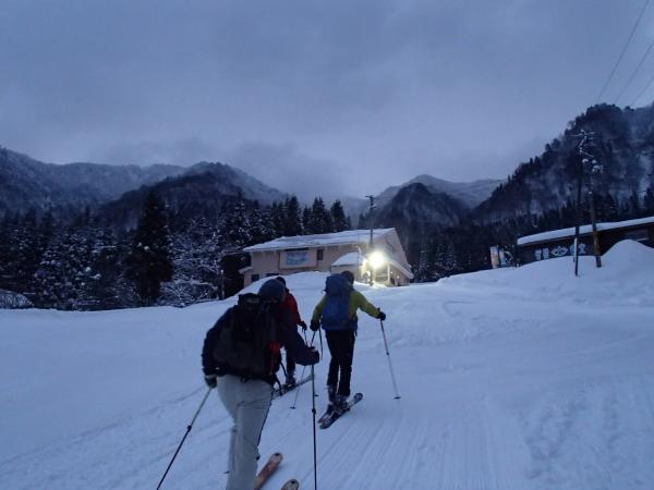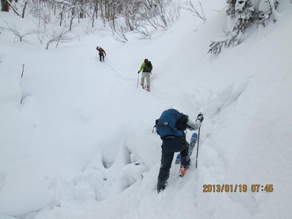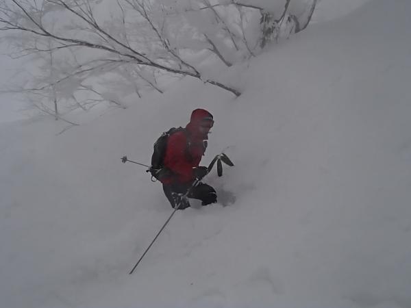 セミファット以上の板で無いと苦しいラッセルが待っています。登るだけなら、スノーシューがベスト