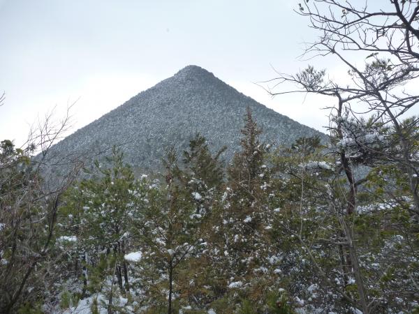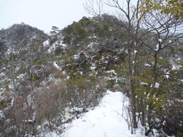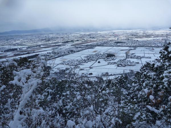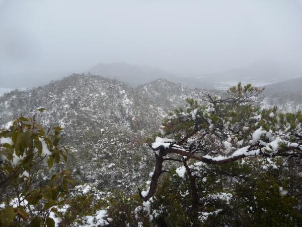 三上山と妙光寺山を結ぶ縦走路は、予想以上にいい所でした。展望が開けているので開放感があり、2山の他に湖南地域の山々や麓・野洲市の街並み、琵琶湖も見渡せました。また、縦走路一帯に生える背丈の低い松やシダ植物が、雪を被って幻想的な雰囲気を醸し出していました。