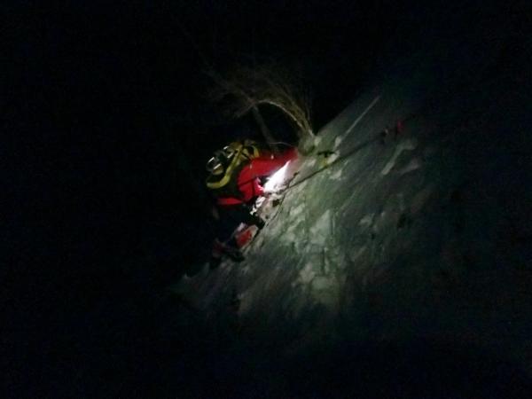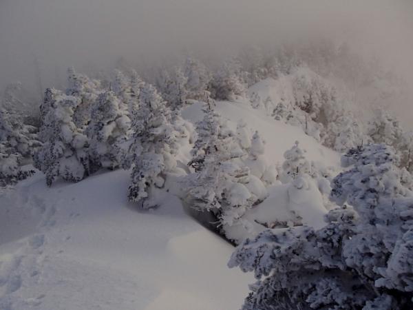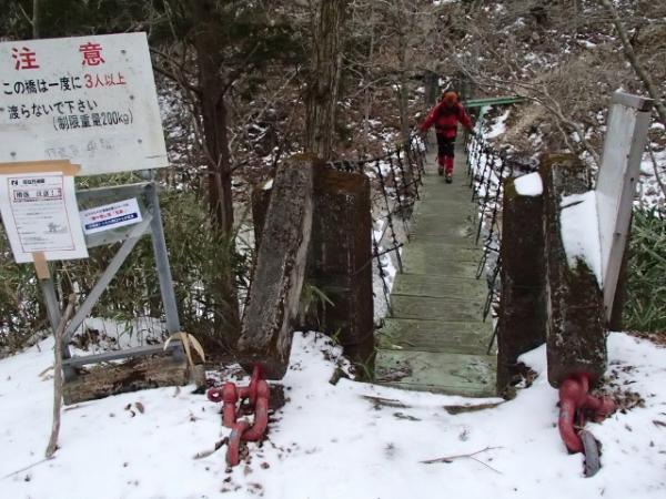 行者還から大川口登山口間の上部は老朽化しており、足場の悪い箇所が続く危険なルートです。目印のテープはありますが積雪のため不明瞭なところも多いです。10本爪以上のアイゼンとピッケル、GPSも有効でした。念のためロープ・ハーネスなどの装備もあった方がよいでしょう。