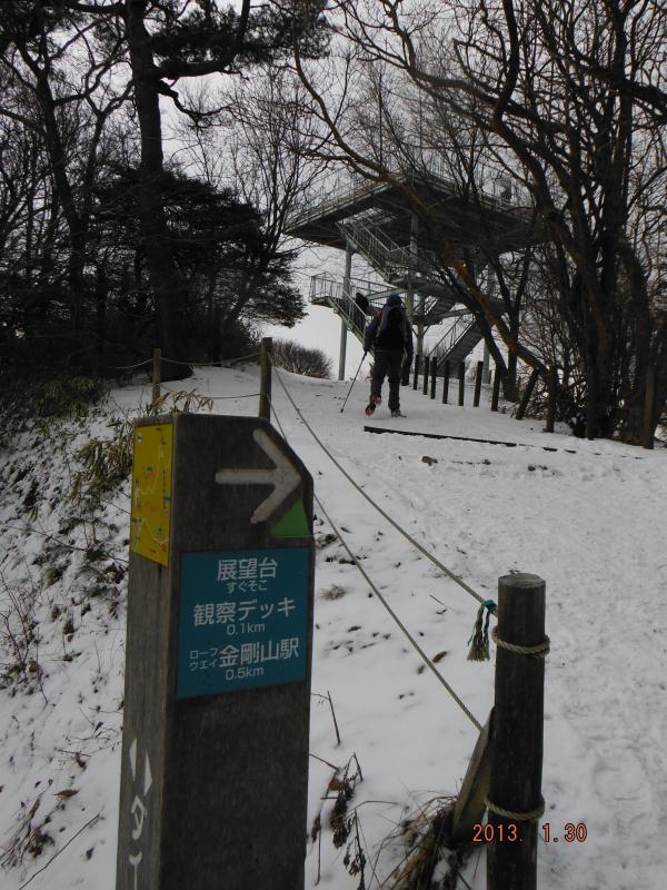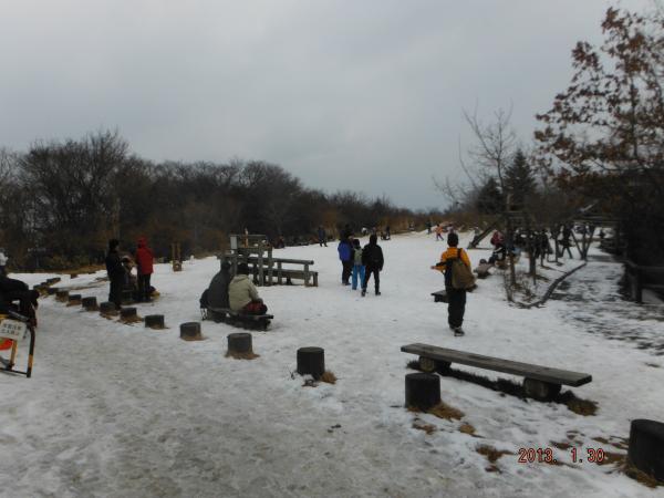 年を越してから気温は低いものの、なかなか雪が降らない日が続きましたが、数日前の雪でだいぶ雪の金剛山らしくなりました。しかし、当日は気温が高く、どんどん雪が解けています。山頂広場には平日にもかかわらず人が多くにぎわっており、金剛山の人気の高さを実感しました。ちはや園地にはロープウェイで上がってきた方も多く、老若男女がそれぞれのスタイルで楽しめる山でした。