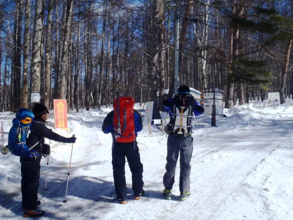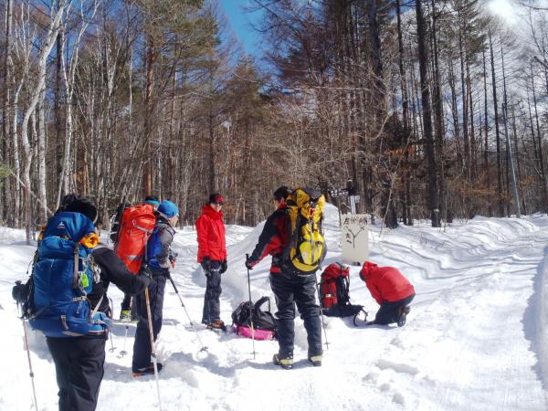 赤岳鉱泉に向かう途中、美濃戸山荘前で円陣を組み、気合いを入れて、