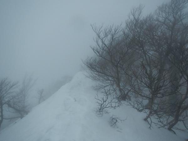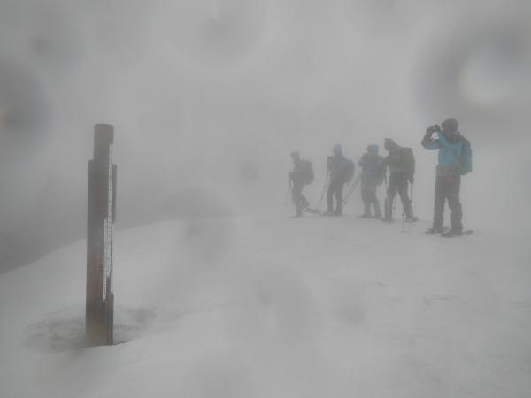 今回のルートはほぼ尾根通しで分かりやすい地形でしたので、天候が悪くても登れましたが、雨と高気温で雪はかなり緩んでいました。