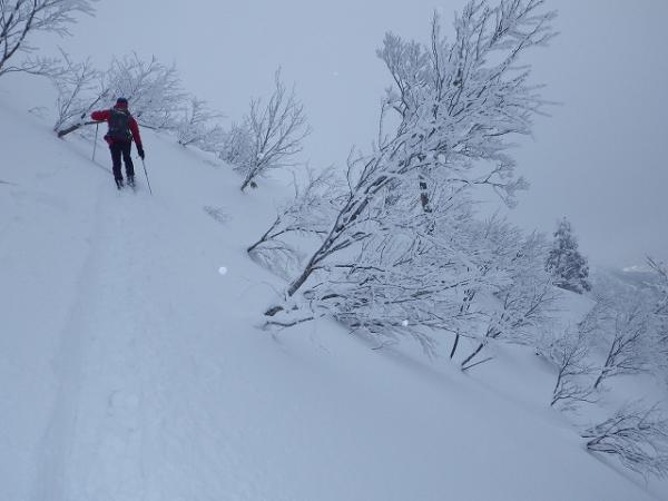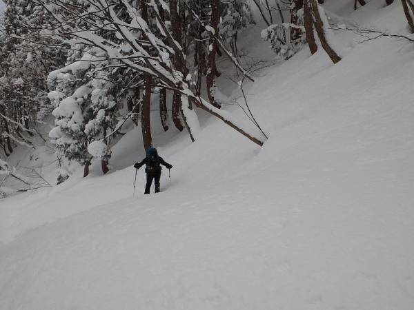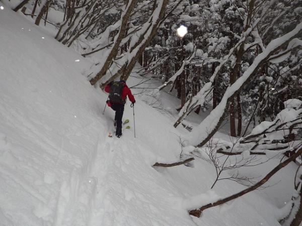 北斜面に飛び出しますが、藪がうるさいので当初計画の3分の1の所で、
