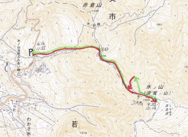- 「氷山命水」870m発6:16→(147分)→1270m尾根上8:43→(67分)→氷ノ山山頂1510m着9:50~発10:16→(99分)→「氷山命水」着11:55