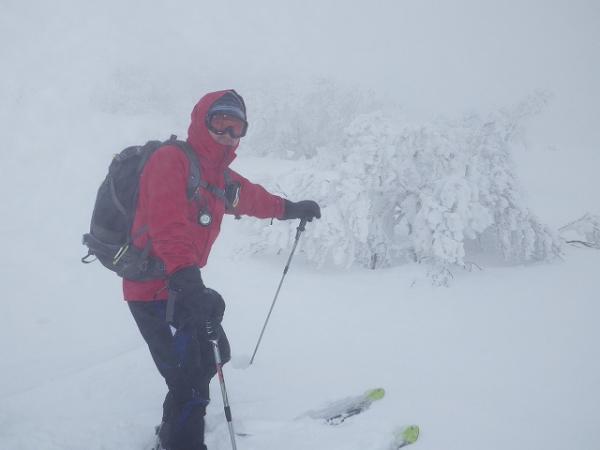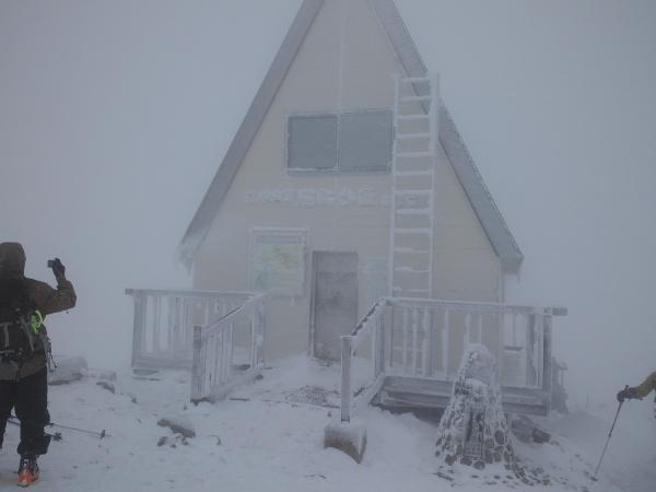 山頂避難小屋で休憩の後、いよいよお楽しみ「滑走」ですが・・・・藪が濃い