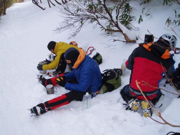 スラブには氷どころか雪も付いていませんでしたが、アイゼンを付けてのクライミングの練習は出来ました。