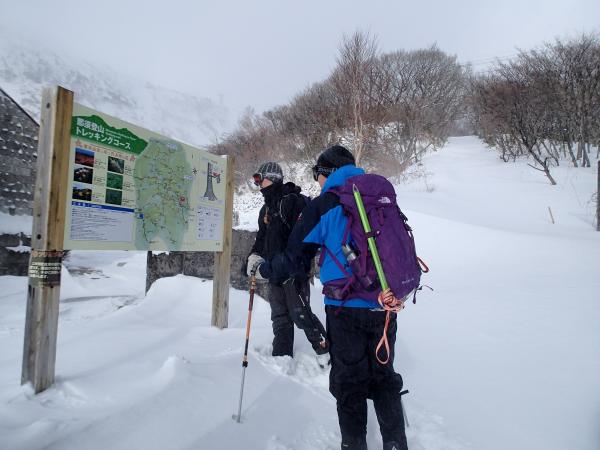 - 大丸温泉駐車場から先は冬季閉鎖中のため車は通れません。ロープウェイの運行も例年3月下旬以降となります。登り初めからトレースがなく膝までの雪で歩きにくかった為時間がかかりました。