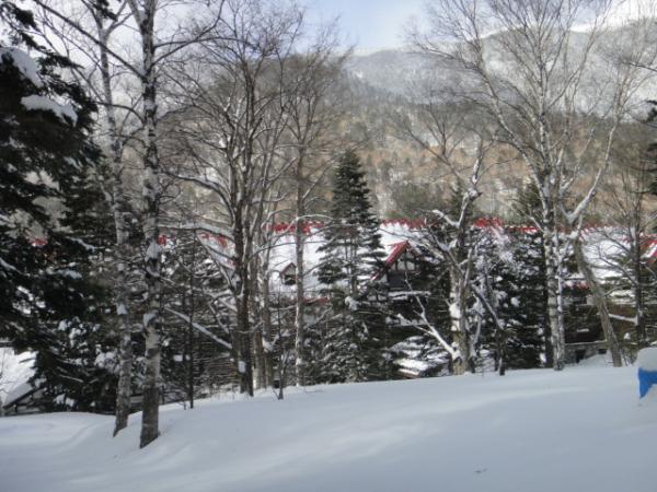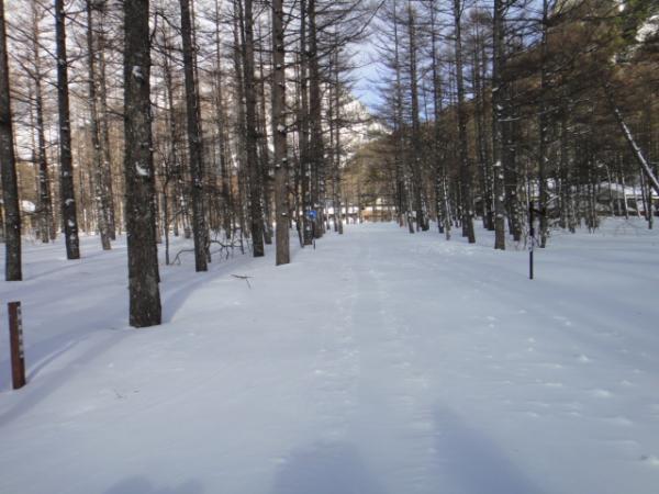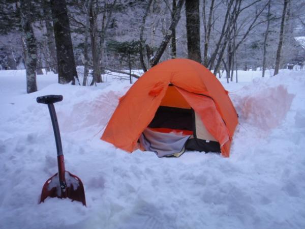 そして雪の中でヒッソリしている帝国ホテルを横目に、バスターミナルへと進入。雪が何メートルあるのか分かりませんが、電柱の天辺に手が届きそうで感動しました。そして小梨平の幕営場へ。なんとなく壁になっていて、トイレの近くで、という条件の場所を選定してスコップでオラオラと雪をかき出す。そしていつの間にか行方不明な我がデジカメを捜索しつつ、気付けば17時30分。