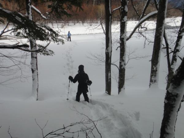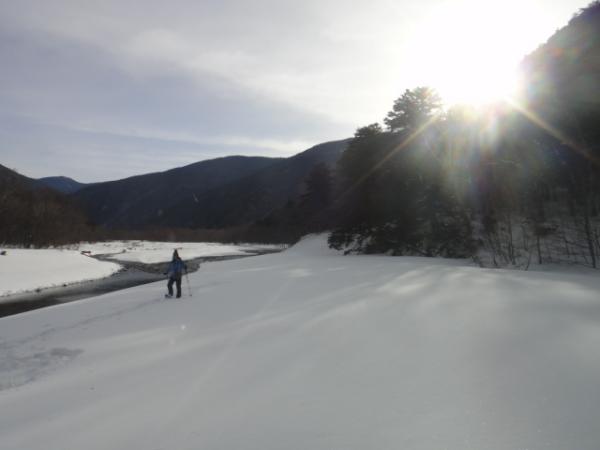 梓川沿いにマシュマロみたいにフワフワしそうな箇所があったので、斜面を降りてしばし休憩。帰りにスノーシューのヒールリフターを使ってみました。あれは凄いですね。