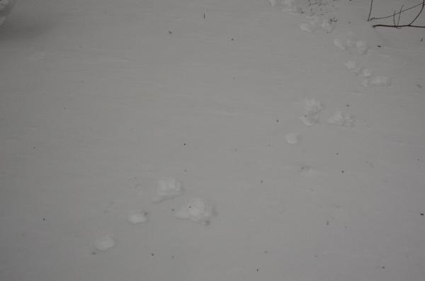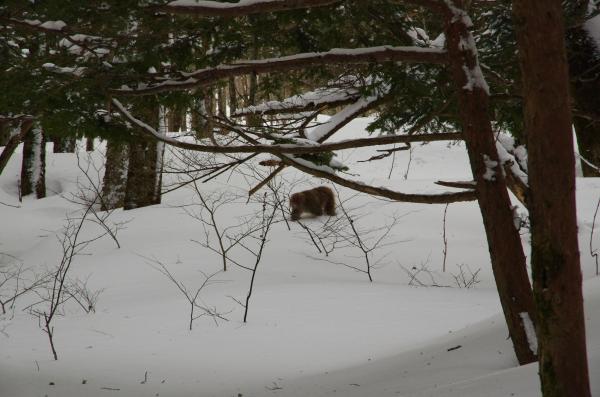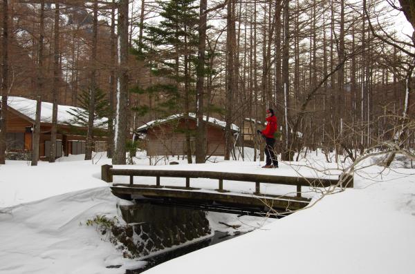 翌日は雪も止み、曇り空ながらお散歩日和。気温は0度を上回っている様子。明神池の方に向かって歩きます。途中で猿の群れに出会ったり、ウサギやイタチ科の足跡(恐らくオコジョ)もありました。