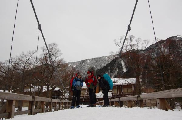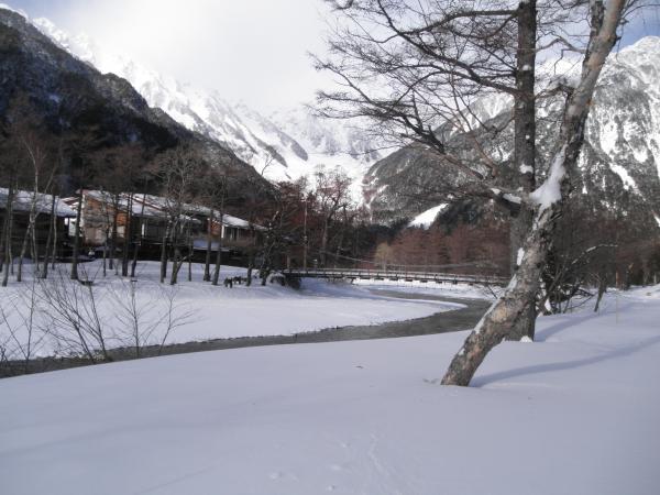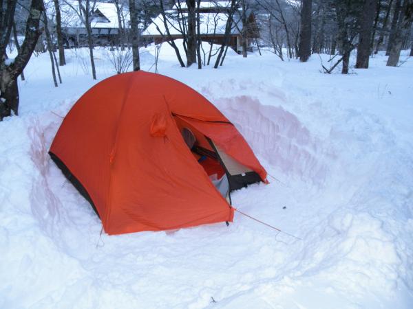 小梨平の冬期トイレの近くにテントを張りました。来る途中に下山する数名とすれ違いましたが、皆さん徳沢園の冬期小屋に滞在していたようです。完全自炊とのことで、テントはなくても結構大きなお荷物を背負っていました。