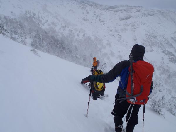赤岩の頭~硫黄岳 ミックス状の広い稜線。山頂に向かって右側に雪庇あり。