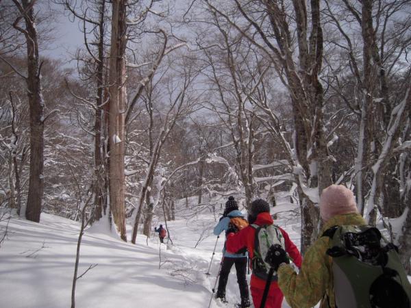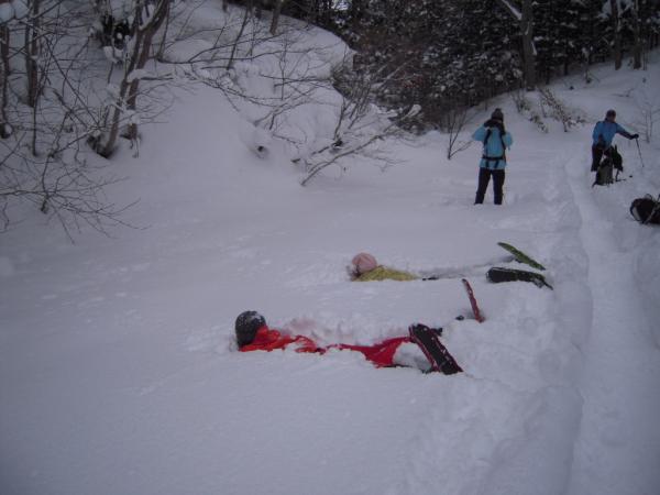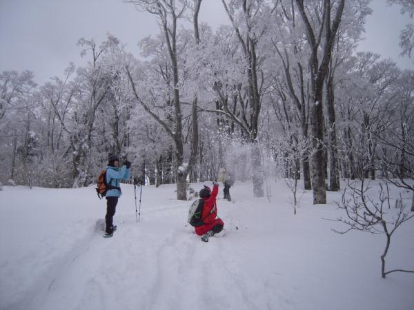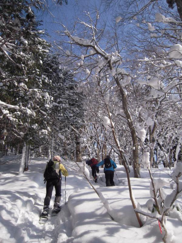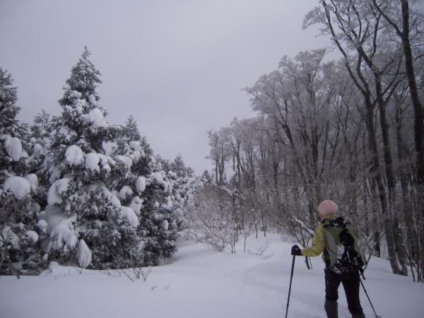 前日のトレースの跡が残っており、沈み過ぎることもなく、気温も低め(-5℃程度)だったので、雪もさらさらでした。