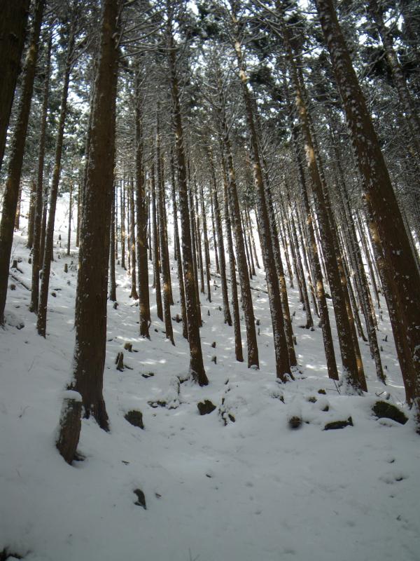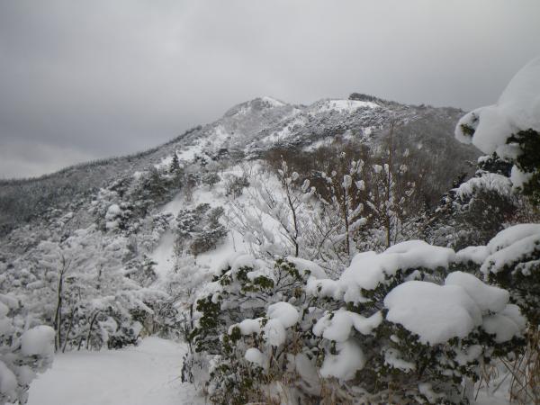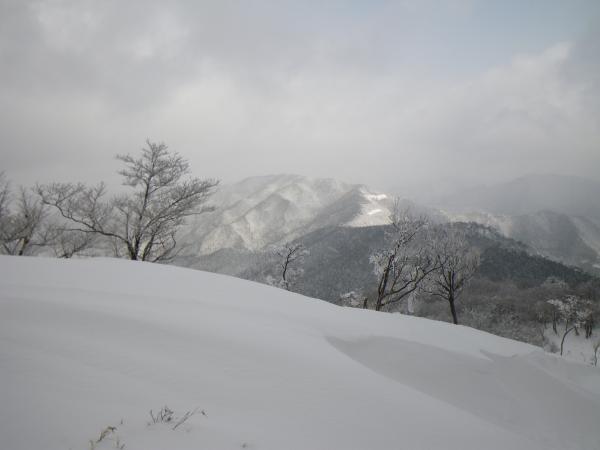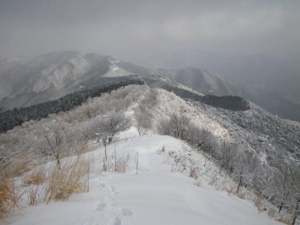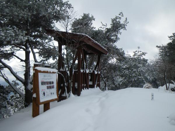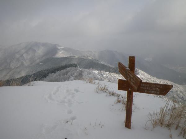 千ヶ峰は中国山地最東端の山で、関西100名山の一つ。途中で三谷登山口に寄ってみましたが、車が数台停まっており、こちらが主流かと思われます。今回は千ヶ峰の山の形の写真が撮りたかった為に展望がいい市原コースに回りましたが、思ったより雪が多く、スタットレスでは心配でチェーンをつけるのも面倒なので、坂駐車場1km手前で駐車し、そこからてくてく市原峠を目指しました。市原峠からは短調な尾根道ですが、降雪直後でトレースはあまりなく、さらに頂上200m手前からは膝あたりの雪で思ったより深かったです。このコースは途中から前方に千ヶ峰を見て歩くので、わかりやすい道です。