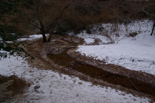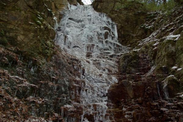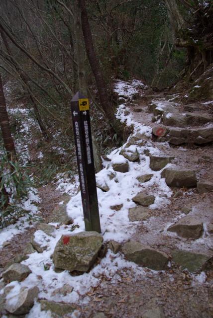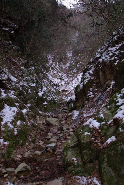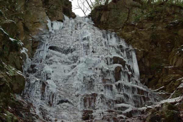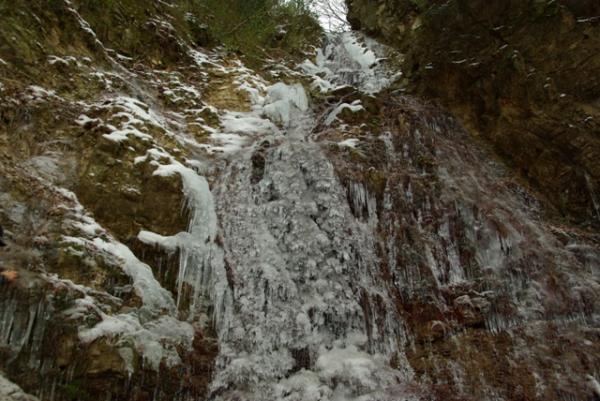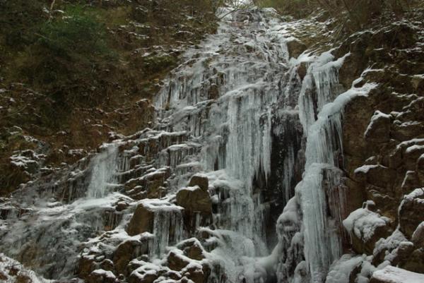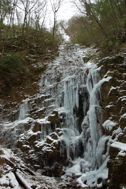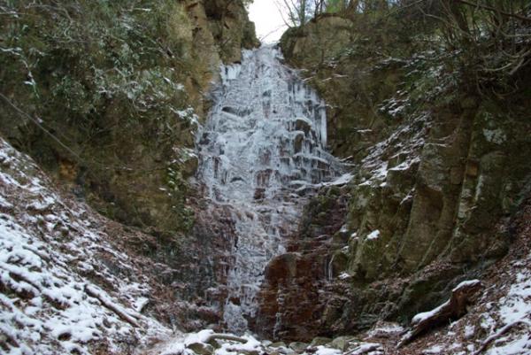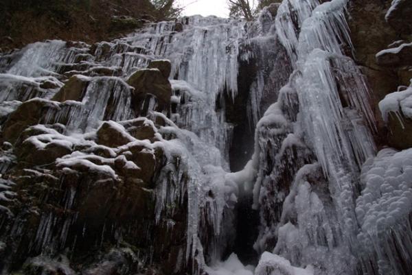 - ところどころ積もった雪が踏み固められ、よく滑ります。軽アイゼン必携です。七曲滝の手前に分岐がありますが、右手(沢沿い)は完全に凍っている箇所で転落の恐れがあり大変危険です。左手(高巻き)を行きましょう。