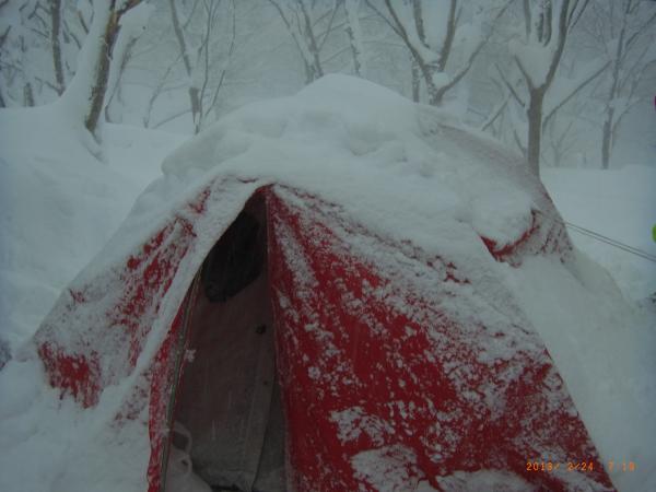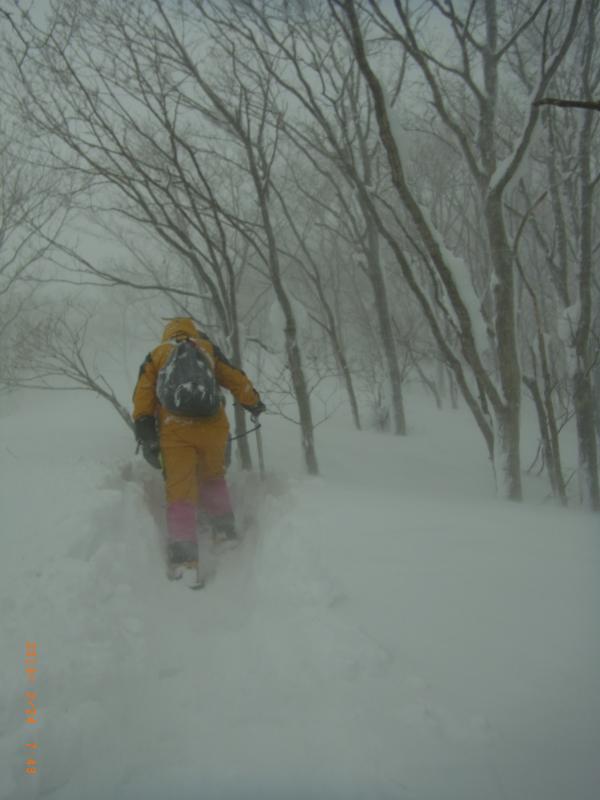 p900で休憩後引き返し、テントに戻りましたが、行きにつけたトレースは早くも消え下りラッセルとなりました。吹雪の怖さを垣間見ました。