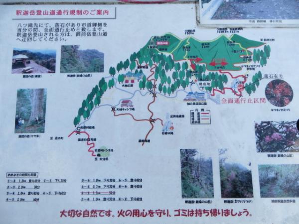 - 御前岳登山口(35分)御前岳第2登山口(35分)御前岳山頂(45分)釈迦岳山頂(5分)普賢岳山頂(20分)矢部越登山口(50分)御前岳登山口 *歩行時間のみ