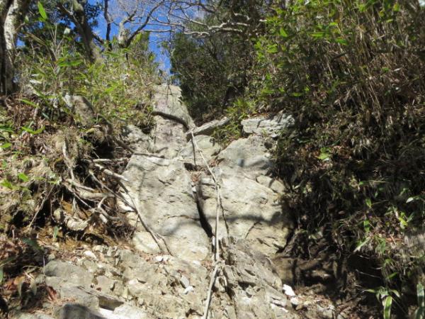 御前岳から釈迦岳までは、危険箇所も少なく、快適な縦走路でした。釈迦岳ピーク手前に北側の斜面を巻いていくように岩場が出てきます。雪はほとんど残っておらず、アイゼンは使いませんでした。