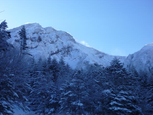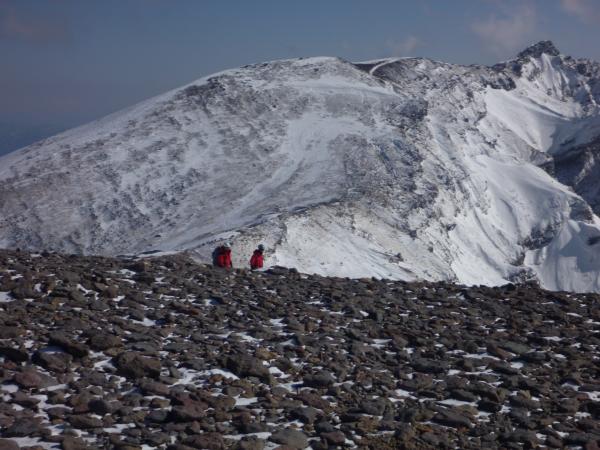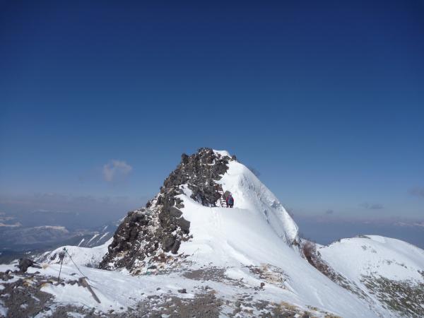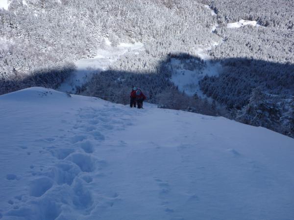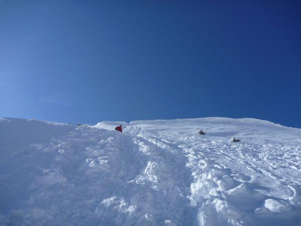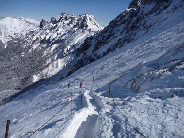 天候は良く気温-8℃位でしたが、稜線上は強風が吹き体感温度は、ぐっと下がりますのでネックゲーター・ニットキャップ・バラクラバ等々で頭部の防寒対策は、しっかりと行いたい。