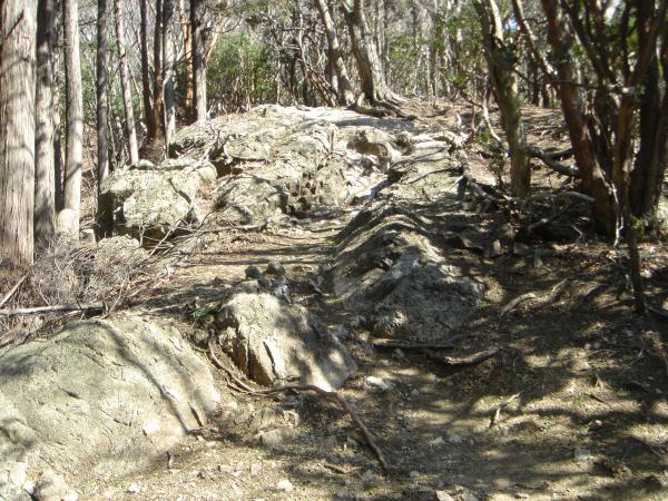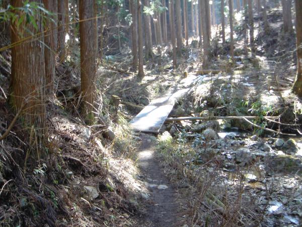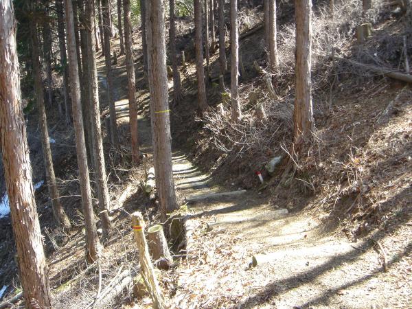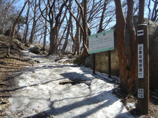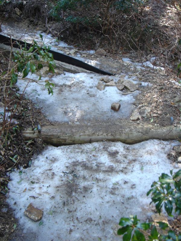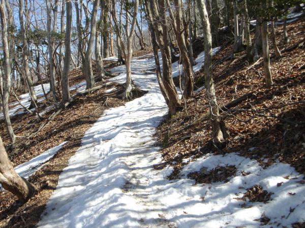 でも、往けども往けども雪の気配なし??高見杉を過ぎた谷筋の日陰あたりから、ところどころに圧雪された雪が残ってはいるものの、周りの景色は春山そのもの。小峠からの登山道の合流地点より、道沿いに雪が張り付き始める。踏みつけられて氷になっているので滑りやすく注意。この辺から軽アイゼンを装着。