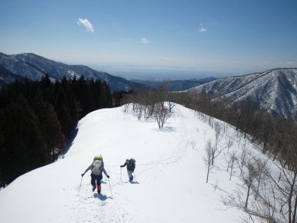 金糞岳は関西100名山の一つで、鳥越林道が走り、開発された山のようなイメージですが、冬山として登るなら深く遠~い山です。雪山なら滋賀側から中津尾根・花房尾根、岐阜側から北尾根、八草峠とあるが、中津尾根が一般的です。その中津尾根を使って、今回は行きましたが、かなり長い山行になります。ただ今回、雪が既に雪質がしまっており、アイゼン・ワカンは必要なく、とても歩きやすく快適でした。ラッセルだとかなり時間がかかる山です。中津尾根上から見る白倉岳・琵琶湖方面、金糞岳から見る伊吹山や奥美濃・白山の山々と琵琶湖は最高のパノラマで長く苦労しただけの甲斐は充分ありました。隣の横山岳やブンゲンとともに、この時期のいい山ではないでしょうか?