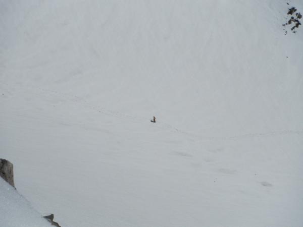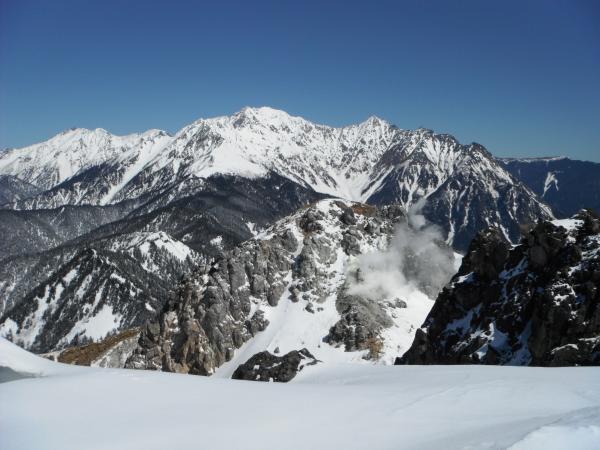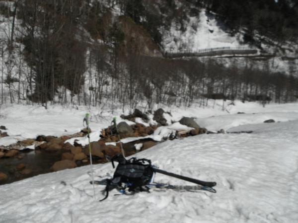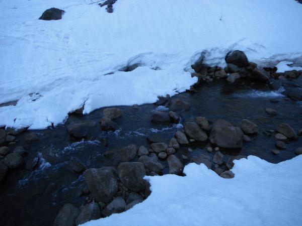 今回厄介だったのが梓川の渡渉。雪も大分融けてきて、腐った雪を踏みぬかないか緊張しました。案の定、帰りの渡渉は片足雪を踏み抜き、ズッポリ水に浸りました。行きじゃなくてよかったです。