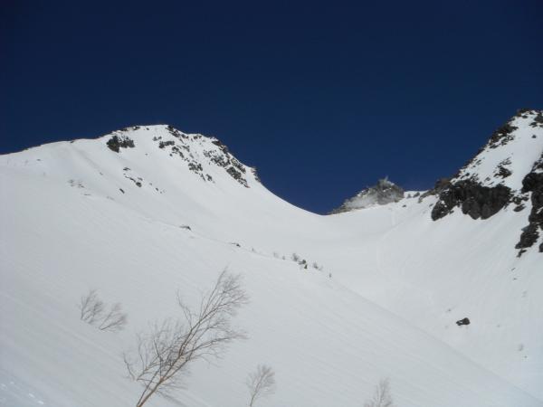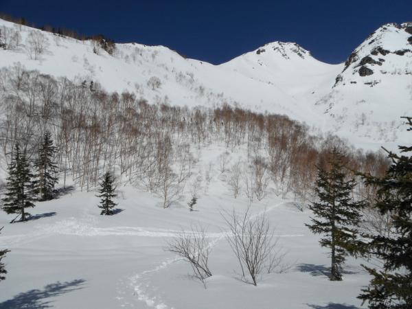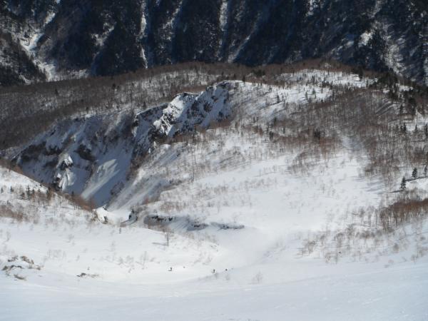 雪崩の可能性が低い尾根上のルートを取りました。右岸尾根下部の急登は心が折れそうになりました。樹林帯を抜けて突如現れる焼岳の噴煙と直下の大カール斜面は迫力満点でした。次回は是非そちらを滑りたいです。