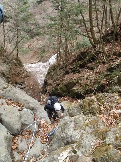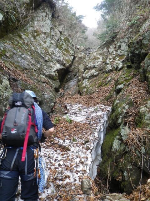 上部は雪渓状になっておりチムニー状7m滝の手前の滝は埋まっていました。