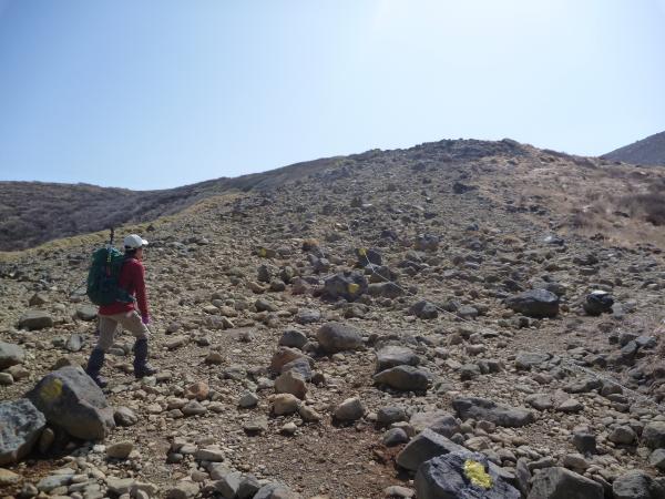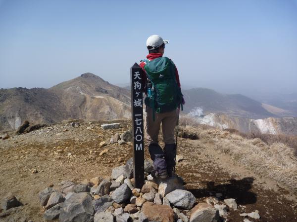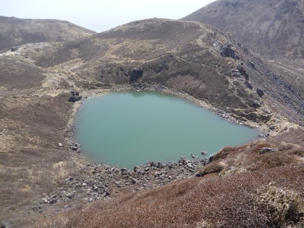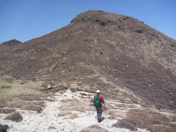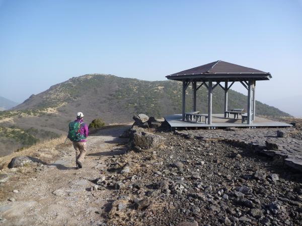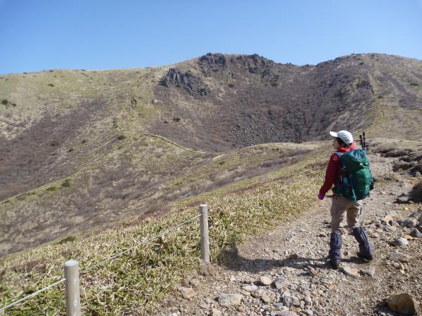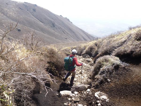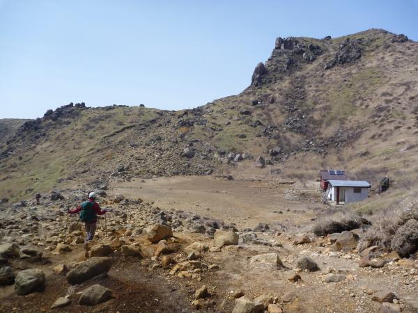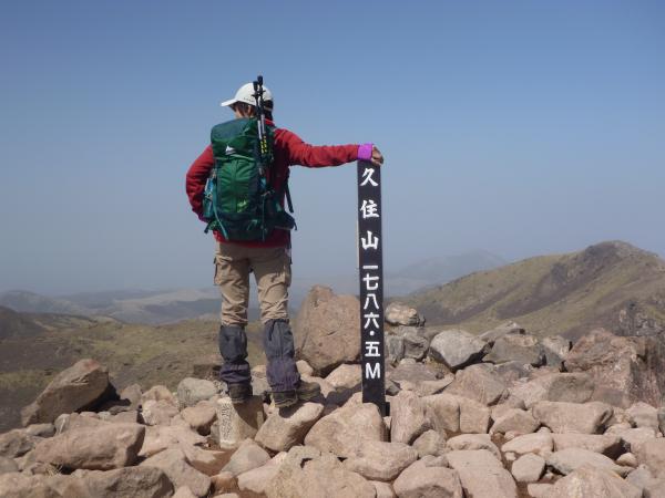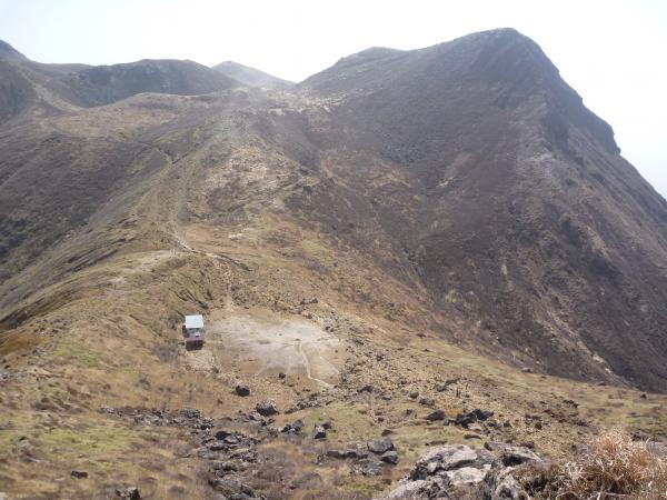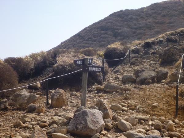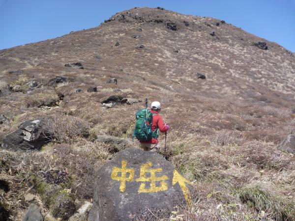 扇ヶ鼻分岐から西千里浜を直進すればダイレクトに久住山に行けるが、今回は星生山(ほっしょうさん・1762m)経由で向かうことにしました。星生山の山頂から反対側を見下ろすとガスの噴気を目の当たりにでき、同時に硫黄の匂いも強く感じます。鼻孔はヒクヒクします。小休止をしてからメインの久住山に向かうため「久住分かれの分岐」まで下り、黄色いペンキマーク見ながら登り返すと久住山(1786m)に到着。山頂は広く展望も良いのでちょっと一服。今回の目的は久住山でしたが、時間的にも余裕があったのでそのまま稲星山(1774m)、九州本土最高峰の中岳(1791m)、天狗ヶ城(てんぐがじょう・1780m)と周遊して久住分かれ分岐から西千里浜を通過し牧ノ戸峠へ向かいました。