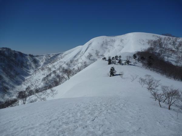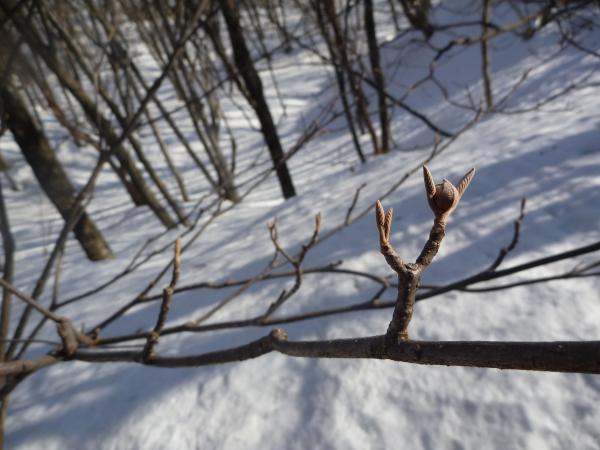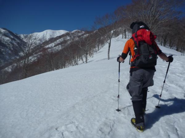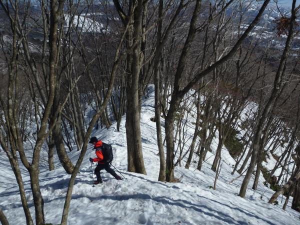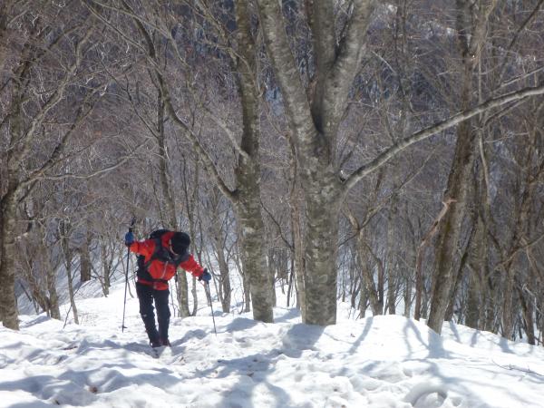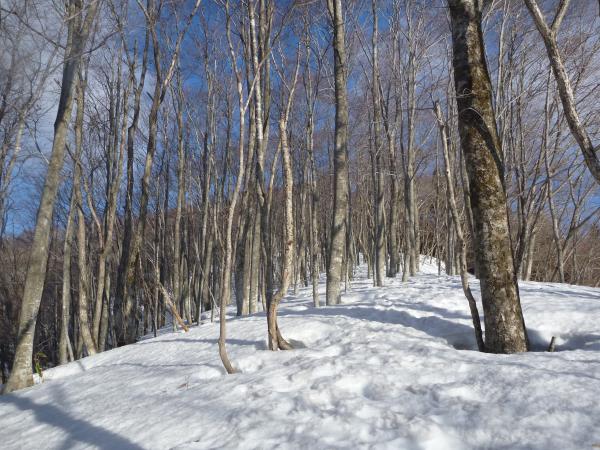 - 雪はいわゆるモナカ状で、表面は硬めですが、体重をかけると沈み込むという少し歩きづらい雪質でした。あとはカチカチのアイスバーンで、バランスを崩すと数mは下へ滑っていってしまうような箇所もありました。アイゼンは使いませんでしたが、念のため、ザックに忍ばせておけばよいでしょう。