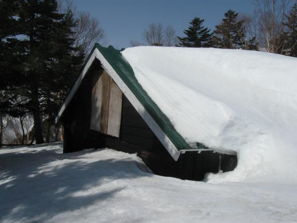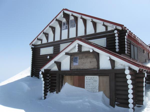雪に覆われた合戦小屋の前で休憩をとりつつ雪山の装備を整えたら、尾根上を歩いて稜線を目指します。