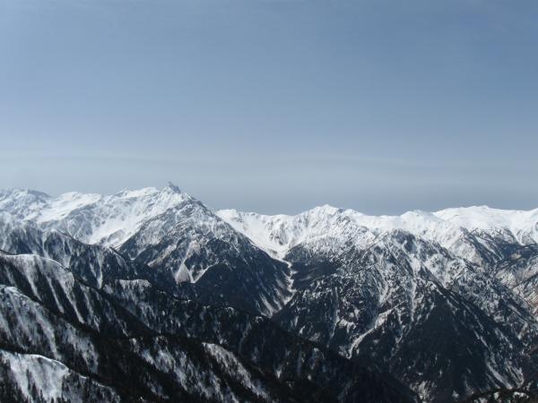 山頂からは普段見ることのない雪に覆われた北アルプスを一望。