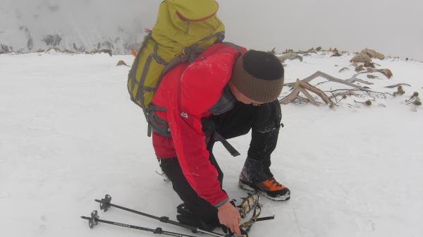 残雪期の北アルプスでは入門的なコースの唐松岳。 天気の良い日は展望の良いところですが、当日は丸山付近から雲の中へ突入、比較的弱めでしたが風に飛ばされた雪が冷たく感じました。 薄手のフリースのフードが、バラクラバの代わりになり重宝しました。 丸山までは各ケルンが目印、丸山以降はある程度地形を頭に入れておくことが必要だと感じます。 視界不良・強風時は無理せず引き返してください。